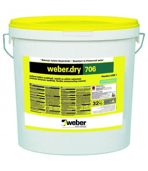 Weber Dry 706 Polimer modifiye, bitüm kauçuk esaslı, çift komponentli, yüksek elastik, kalın su yalıtım kaplama malzemesi.