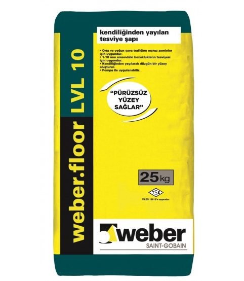 Weber Floor Lvl 10 1-10 mm arasında uygulanabilen, çimento esaslı, yüksek performanslı, kendiliğinden yayılabilen tesviye şapı.